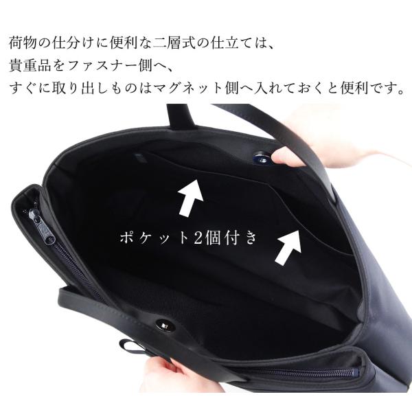 荷物の仕分けに便利な二層式の仕立ては、貴重品をファスナー側へ、すぐに取り出しものはマグネット側へ入れておくと便利です。