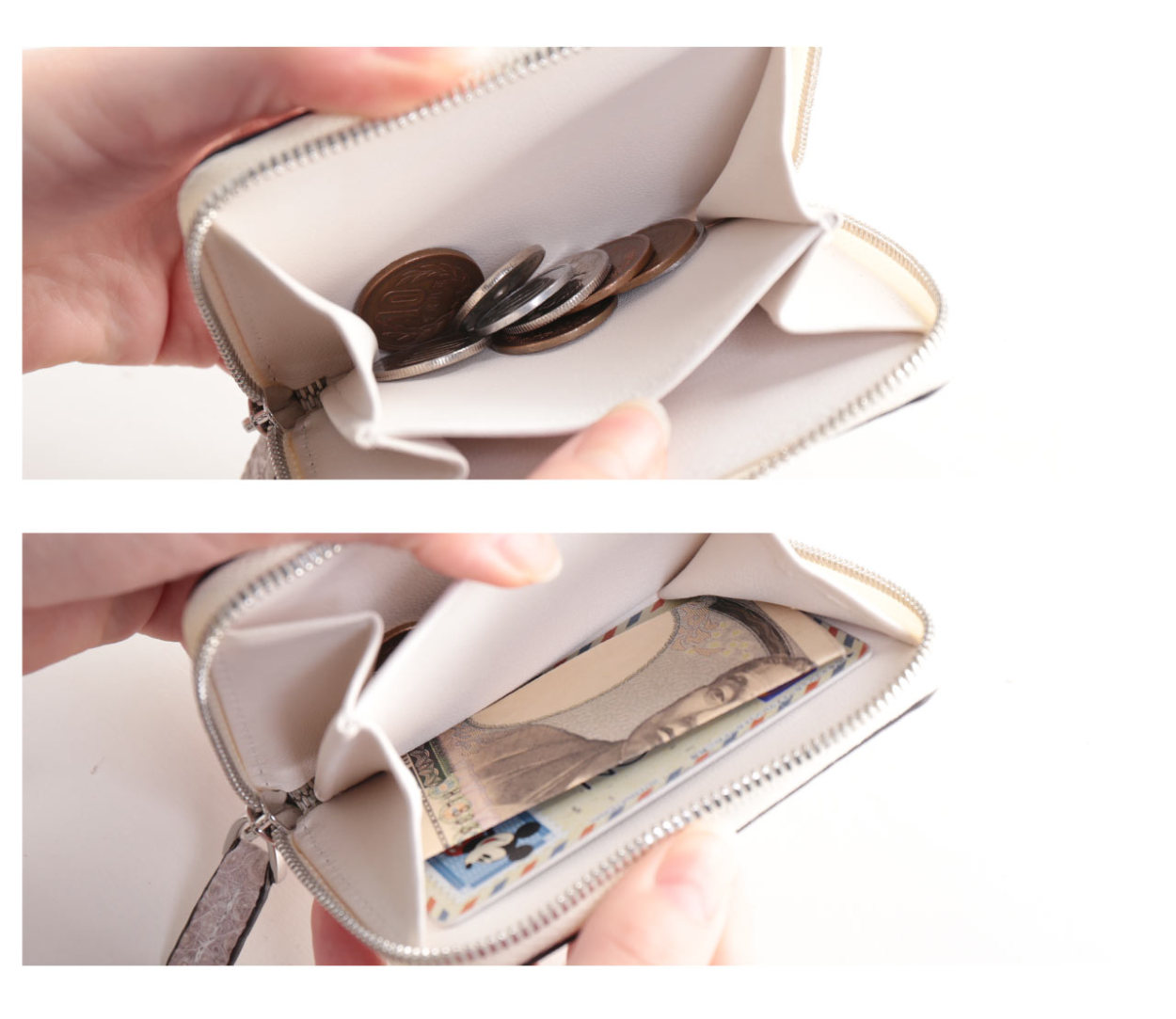小銭はもちろん、カード、一万円札も折って収納できるので、小さくても便利なアイテムです。