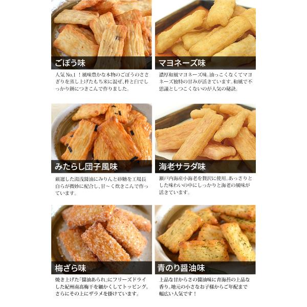 ■詰合内容:ごぼう味・マヨネーズ味・みたらし団子風味・海老サラダ味・梅ざら味・青海苔醤油味