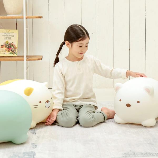 すみっコたちはやわらかい素材で、乗って遊んでみたり、もたれてくつろいだり。