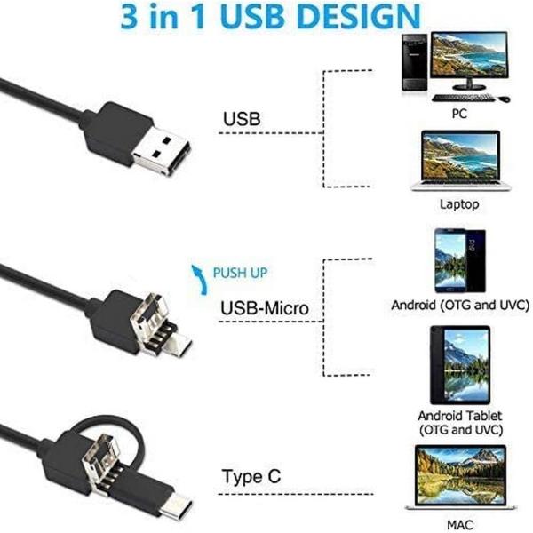 ・【3 in 1 USB内視鏡カメラ】3 in 1 接続アダプター付きで、幅広い交換性があります。Windows、Macパソコン、Androidスマホ(バーション:4.4 +)に対応。リアルタイムビデオ視聴、ビデオ録画および画像キャプチャなどをサポートすること ができます。