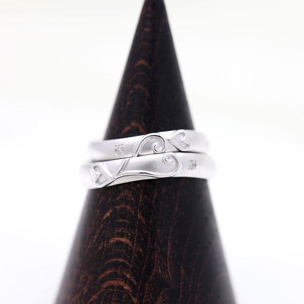 2つのリングを合わせると大きな1つのハート、離れていてもお揃いの小さなハートがあるのがポイント。