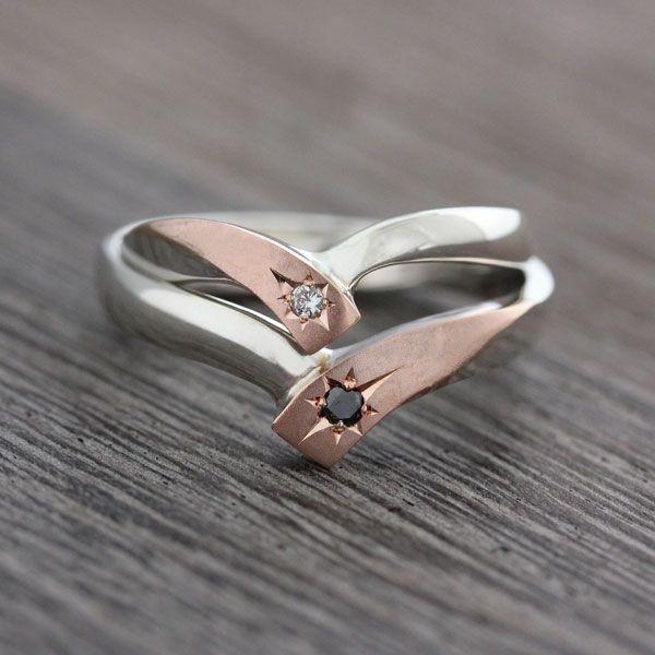 V字の片側をK18ピンクゴールドで作り、つや消し加工を施したリング。