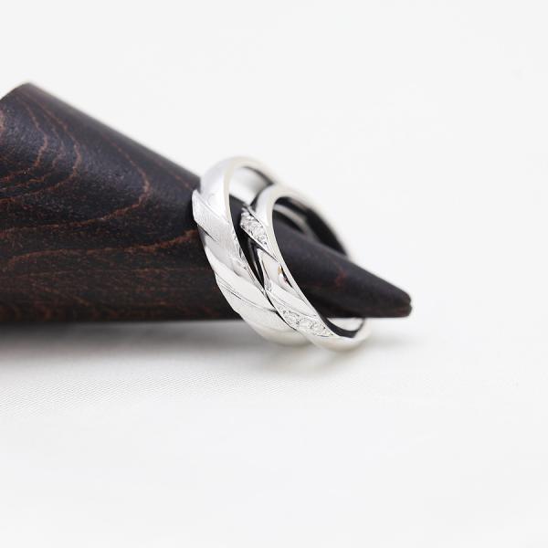 レディースは2本のライン部分にダイヤモンド6石 合計0.04ctを彫り留めし、