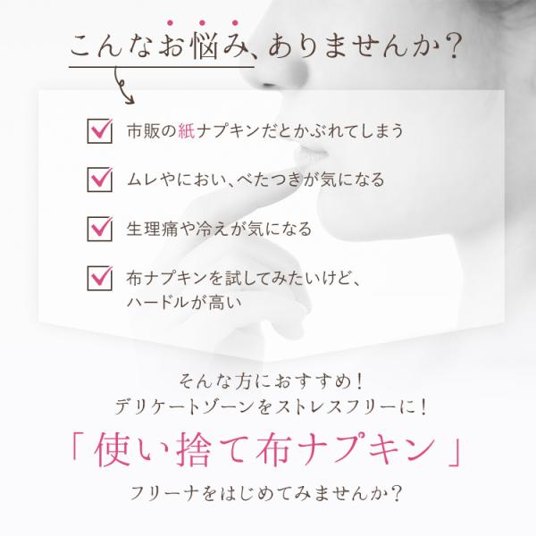 FREENA(フリーナ)は、布ナプキンの肌ざわりを気軽に体感できる「使い捨てタイプ」の布ナプキンです。紙ナプキンによるムレ、カブレが気になる方、布ナプキンに興味はあるけれど繰り返し洗って使うことに抵抗があるという方におススメ!