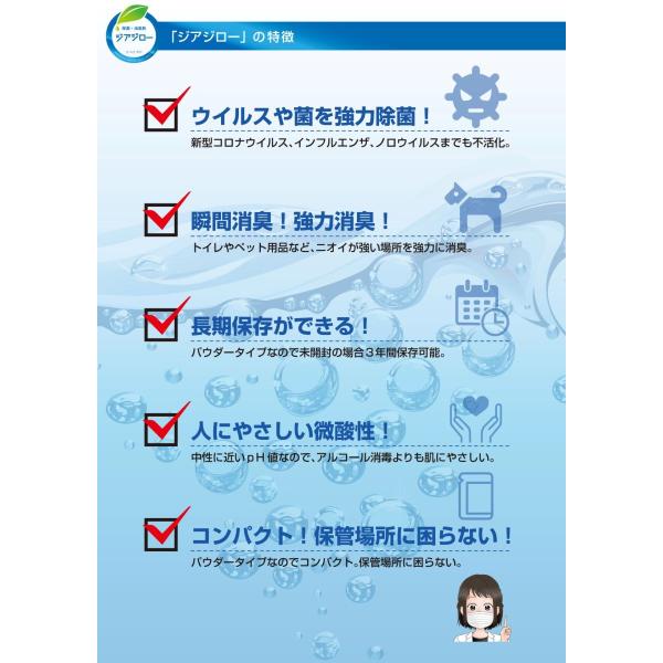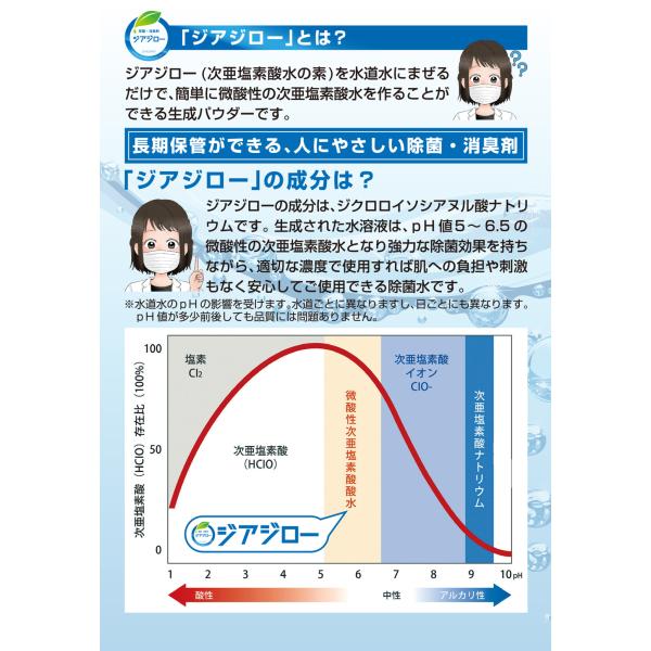 ジアジローは、水道水に1包溶かすだけで簡単に微酸性の次亜塩素酸水を作ることができる生成パウダーです。
