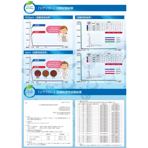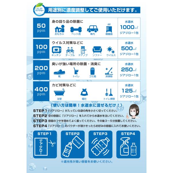 ジアジロー1包を500mlの水道水に溶かすと濃度100ppmの微酸性次亜塩素酸水が生成できます。