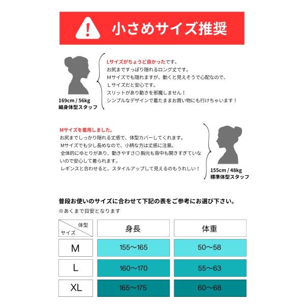 お尻が隠れるほどのゆったりとしたロング丈で、気になるお腹、おしりを隠してくれます。スリットが入ってるので、身体の動きを妨げず、しなやかな動きが出来ます。