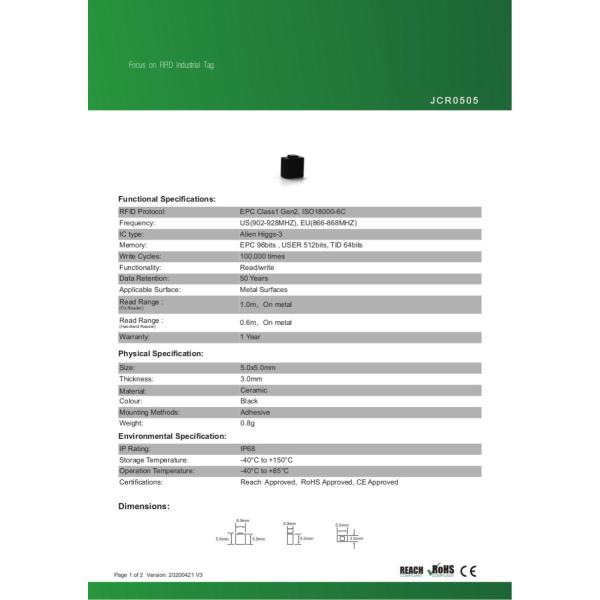 金属対応タグ Alien Higgs-3 JCR0505 RFID ICタグ 裏面テープ付き 周波数帯902MHz〜928MHz セラミック 産業用特殊タグ 数量1個