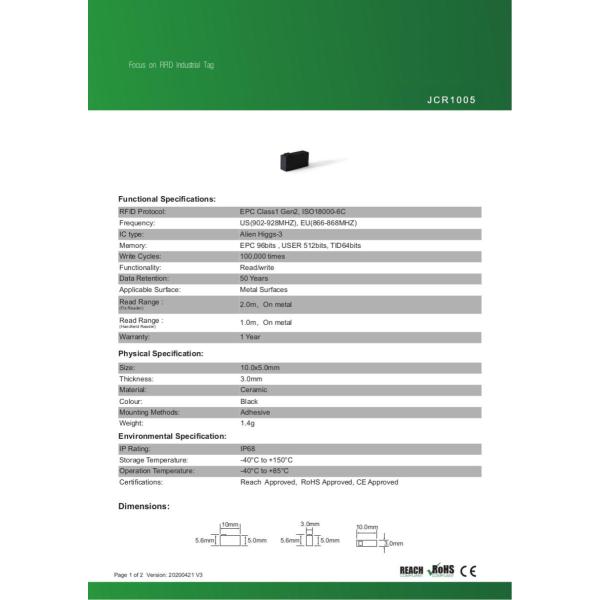 金属対応タグ Alien Higgs-3 JCR1005 RFID ICタグ 裏面テープ付き 周波数帯902MHz〜928MHz セラミック 産業用特殊タグ 数量1個