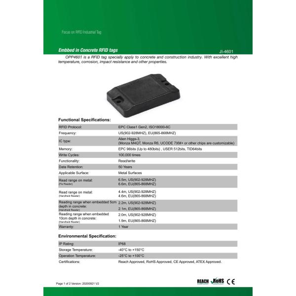 コンクリートに埋め込むことで建設プロセスの管理を改善する建築材料を一意に識別することができます。深さ5cmまで埋め込みが可能です。