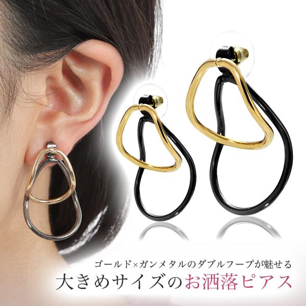 ダブル フープピアス レディース 大きめサイズ ダブルリングピアス シルバー925 (14Kゴールド)