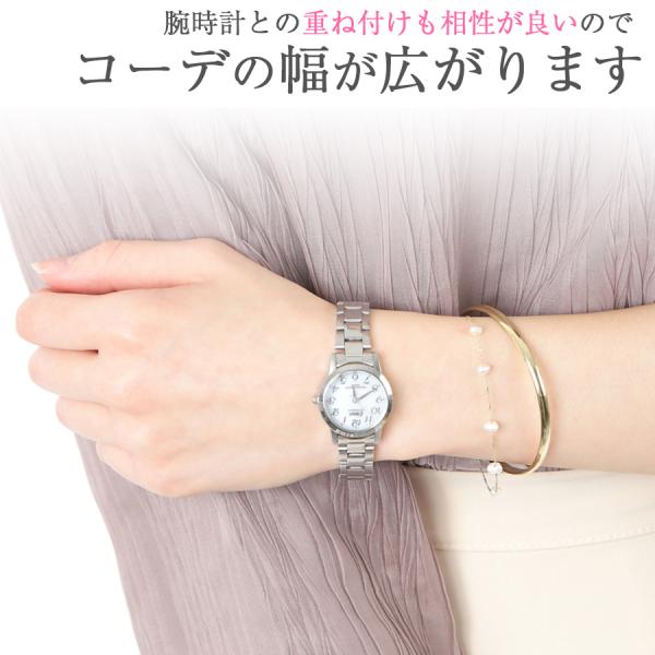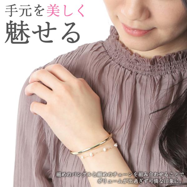 華奢なデザインで手首を美しく魅せるオシャレなダブルブレスレットです。 細めのバングルと細めのチェーンを組み合わせることでボリュームが出過ぎず可憐な印象に。ゴールドの大人っぽさと、優しい雰囲気の小粒パールがお手元をさりげなく、華やかに飾ります。