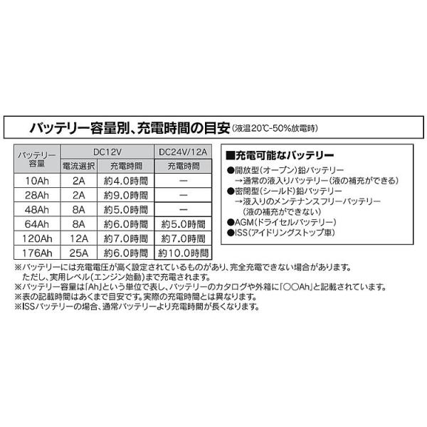 ●適合バッテリー:DC12V・24V(開放型・密閉型・AGM・ISS)鉛バッテリー