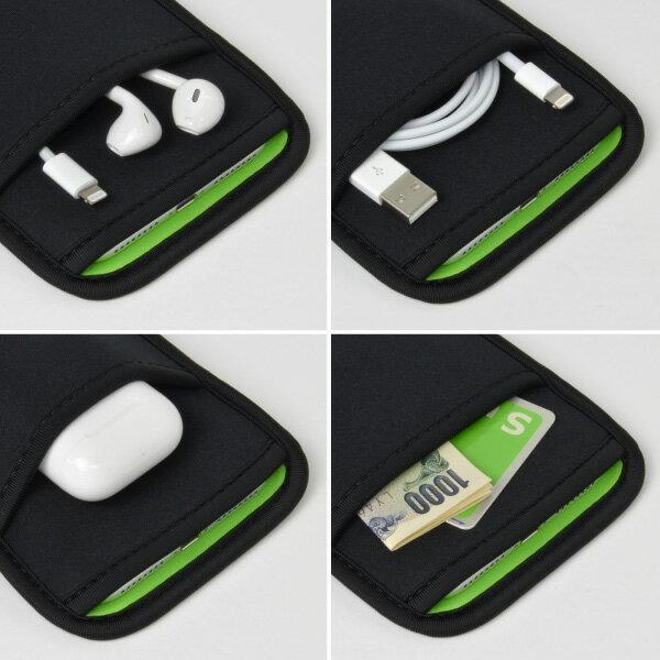 ・スリーブ前面に「イヤホン」や「Lightningケーブル」「AirPods」などの周辺機器を収納する事が出来る便利なポケット付。