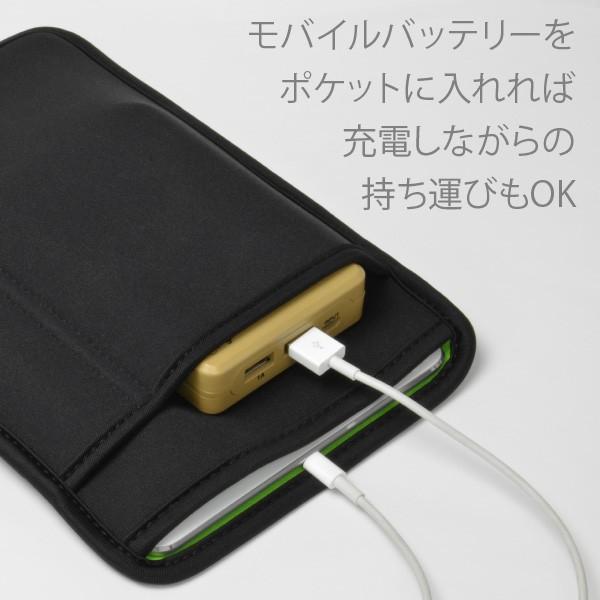 スリーブ前面に「イヤホン」や「Lightning充電ケーブル」等の周辺機器を収納する事が出来るポケット付。