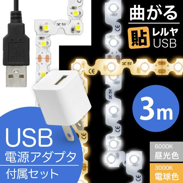 爆買LED テープ ライト (USB AC電源付)LEDテープライト(90度 曲がる)貼レルヤ USB(昼光色 6000K/電球色 3000K)3m+USB電源アダプタ セットカット 長さ 調節