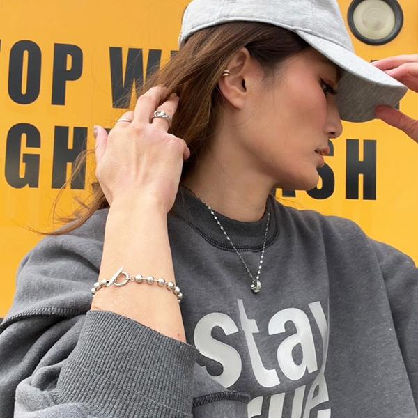 大きすぎず小さすぎない、ちょうどいいサイズ感のボールチェーンは、モードで都会的な雰囲気を演出します。ボールを繋ぐワイヤーも全てステンレス製で丈夫にアレルギー無しでお楽しみ頂けます。留め具も同じくモードな印象のマンテルデザイン。シンプルなデザインで着けやすい幅感のブレスレットです。