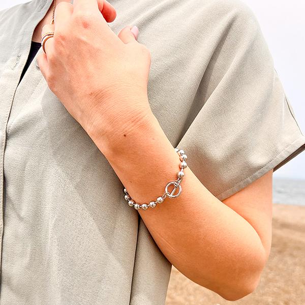 マンテルデザインの留め具がアクセントのボールチェーンブレスレット。