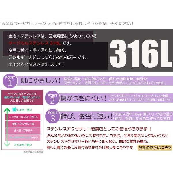 当店のステンレスは、医療用品にも使われているサージカルステンレス316Lです。変色もせず・傷・汚れにも強く、アレルギーを起こしづらい安心な素材です。 半永久的な輝きを演出します!