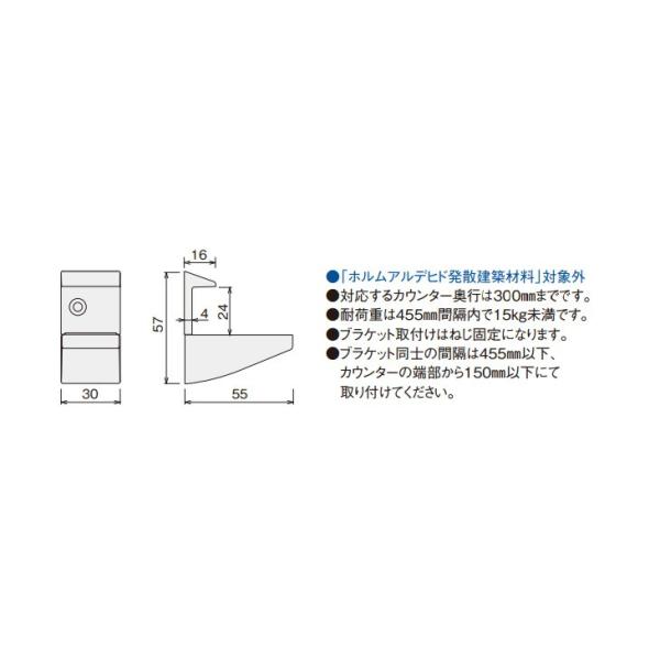 ●ブラケット同士の間隔は455mm以下、カウンターの端部から150mm以下にて取り付けてください。