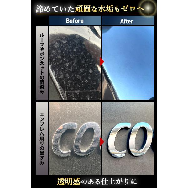 ?【Wゼロ処方で水垢に終止符を。】界面活性剤ゼロで残留リスクを極限まで抑え、研磨剤ゼロでクリア塗装を傷つけず、ヌルつきのないスッキリとした仕上がりに。 施工後もシャンプー洗車不要で、水で流すだけ!