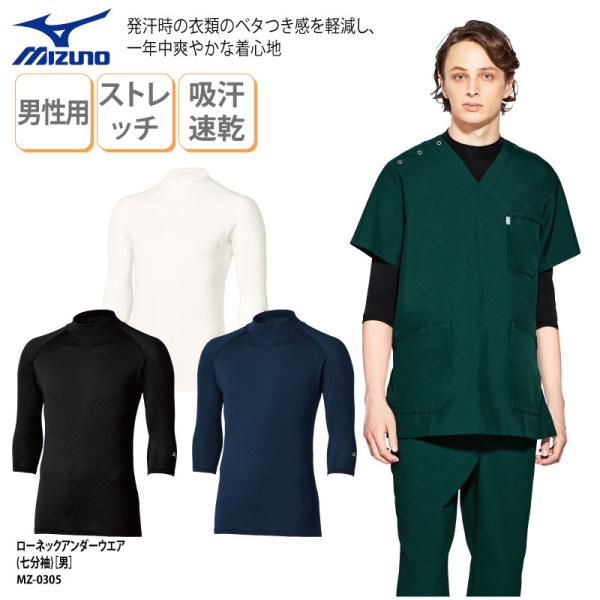 インナー アンダーウェア ローネック 人気 7分袖 スクラブインナー 男性用 メンズ 黒 紺 白 ストレッチ 吸汗速乾 MIZUNO MZ-0305
