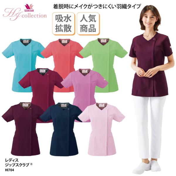 Wacoal ジップスクラブ 半袖 人気 白衣 女性 看護 ナースウェア 介護 軽量 医師 薬剤師 クリニック ワコール FOLK HI704 刺繍 プリント 爆買
