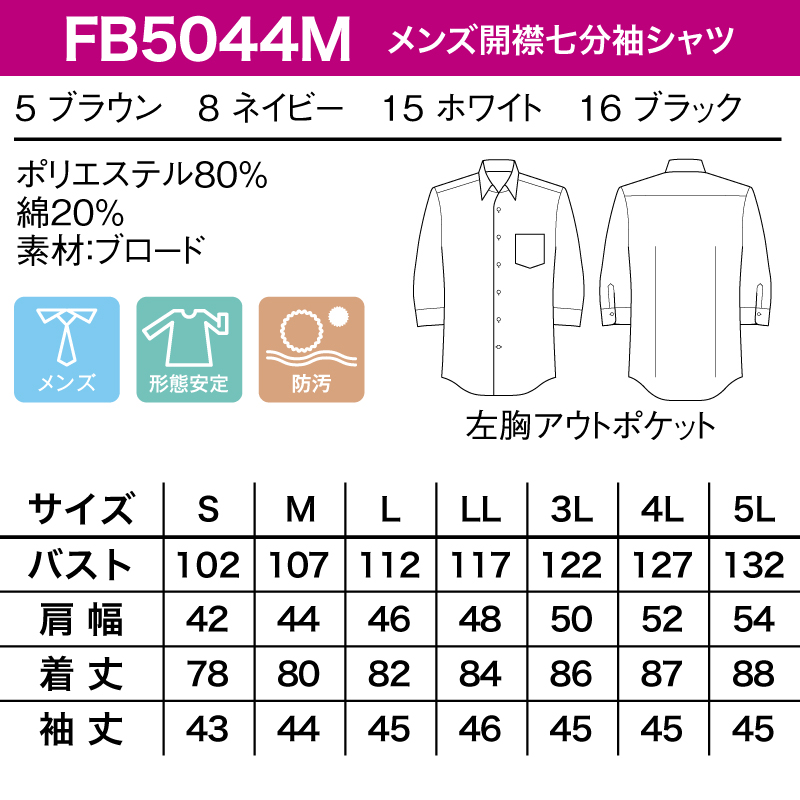 シャツ ワイシャツ 七分袖 メンズ 開襟シャツ 男性 白 黒 ブラウン ネイビー オープンカラー 形態安定 防汚 ホテル レストラン FACE MIX FB5044M 刺繍 プリント