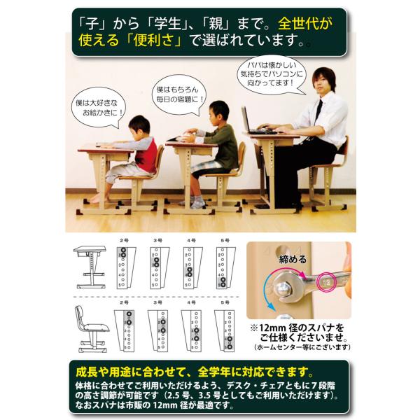 デスク・チェアともに7段階の高さ調節が可能。成長に合わせて長く使えます。
