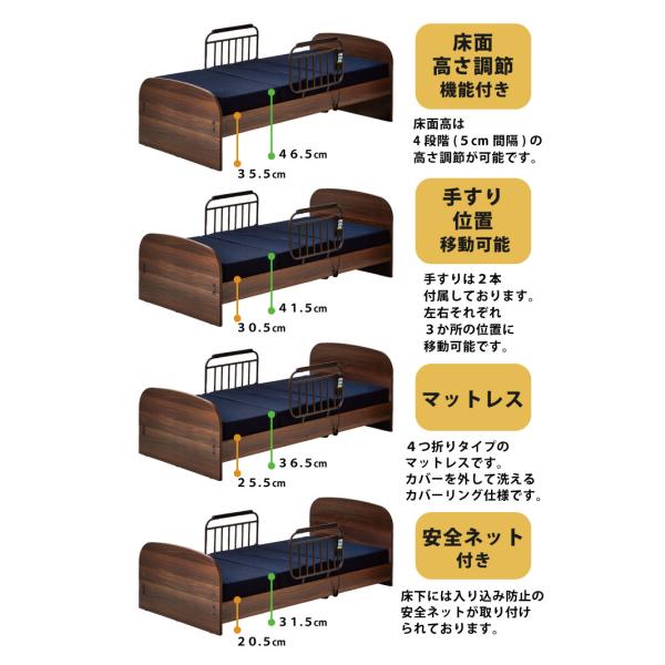 ■手すり2本付きで、転落防止や立ち座りのサポートに。左右それぞれ3ヶ所に付け替え可能です。