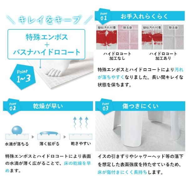 また、安心・安全・清潔をキーワードに開発した特殊エンボス加工により素足での防滑性と水はけ性を実現しました。