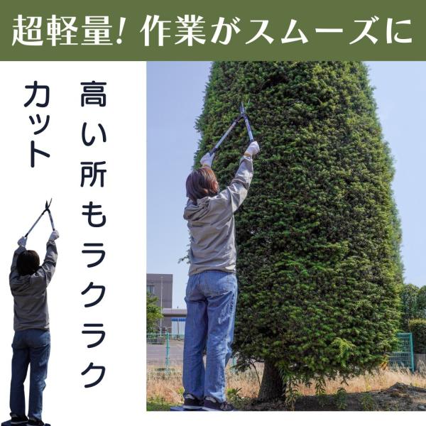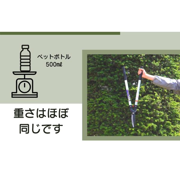 500mlペットボトルとほぼ同じ軽さで、高いところもラクラクカット。庭木の剪定、足元の草刈りなどに便利です。