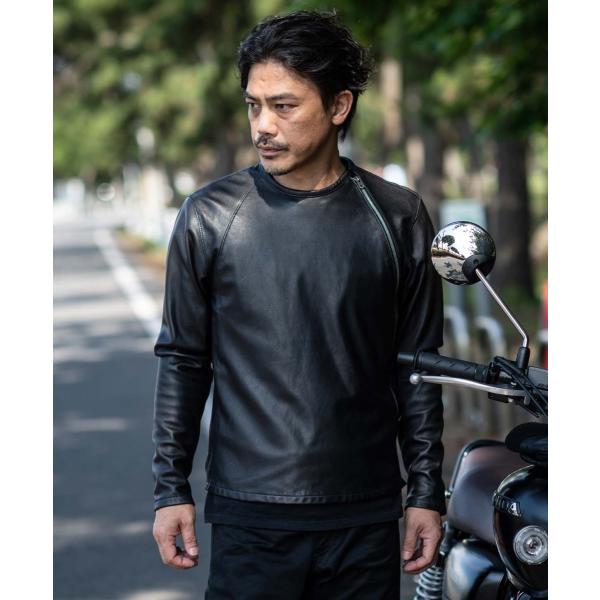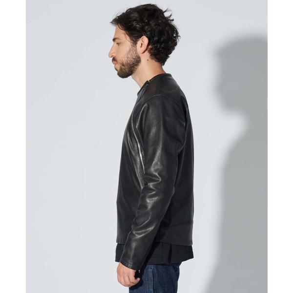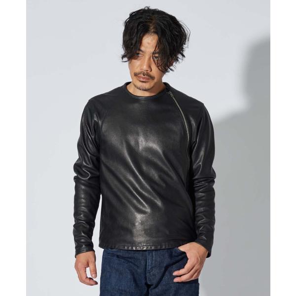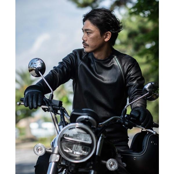 アウターとしてもミドラーとしてもレザーを楽しめる新感覚のライダース。アウター然としない見た目の演出と着用性を考えたラウンド配置のフロントファスナーが特徴。柔軟性に富むゴートスキンとストレッチ性のある裏地で着心地と動きやすさを確保。
