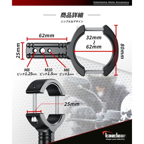 バイク クランプバー 22〜42mm 32〜62mm シンプル 滑り止め 簡単 安心 バイク用 ハンドル ミラー マウント ドラレコ アルミニウム合金 アルミ 製 汎用 サイバーLEDフォグ 1年保証 送料無料 Kaedear カエディア KDR-H21