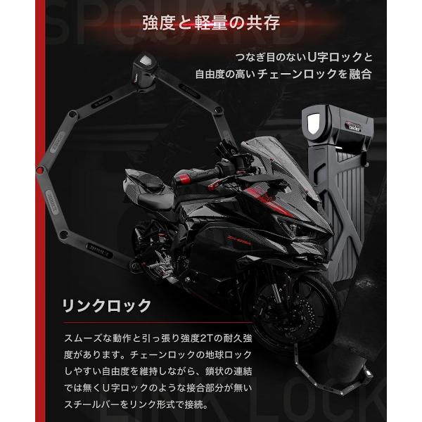 高いせん断耐久強度を持ちながら1325gと軽量。スチールバーのリンク部分にも高品質なリベットを採用し、スムーズな動作と引っ張り強度2Tの耐久強度があります。チェーンロックの地球ロックしやすい自由度を維持しながら、鎖状の連結では無くU字ロックのような接合部分が無いスチールバーをリンク形式で接続し、軽量で強度がありながら地球ロックも可能。コンパクトで持ち運びがしやすいチェーンロックとU字ロックの良いとこ取りがリンクロックです。