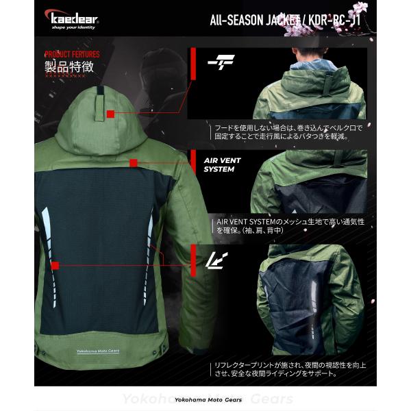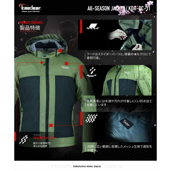 Kaedear カエディア バイク ジャケット バイク用 プロテクター ライディングジャケット パーカー 春夏秋冬 撥水 オールシーズン リップストップ生地 エアーベンチレーション オリーブ バイク用品 オートバイ ライディングギア バイク用ジャケット バイク用パーカー バイク用プロテクター プロテクション プロテクト Yokohama Moto Gear KDR-RC-J1