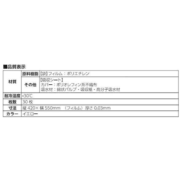 材質:袋/ポリエチレン(炭酸カルシウム配合)、吸収シート/ポリオレフィン系不織布、吸収材/綿状パルプ・吸収紙・高分子吸収材