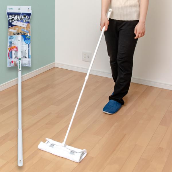 ぞうきんもシートも装着できるフローリングワイパー。から拭き、水拭きどちらでも使えます。