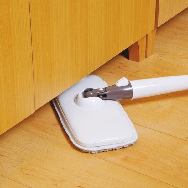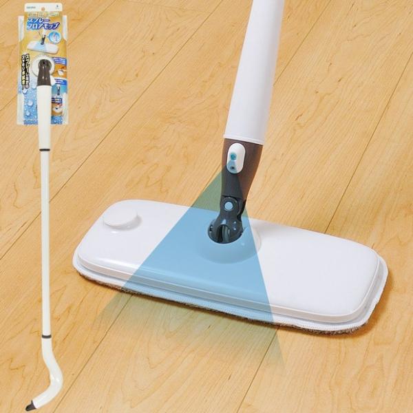 手を汚さずに水拭きができるスプレー付きのフロアモップ。フローリング、Pタイル、クッションフロアなどの水拭き掃除に。