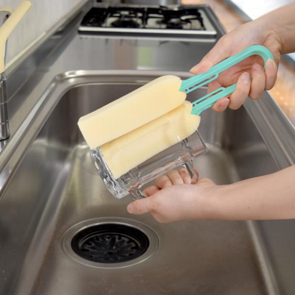 柄が付いたキッチン用のスポンジです。長いサイズなので、底まで手の入らない丈の長いコップを洗うのに最適です。スポンジにコップをはさんで回しながら使えば、両面を一度に洗うことができます。