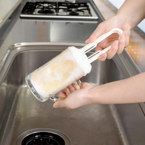 柄が付いたキッチン用のスポンジです。長いサイズなので、底まで手の入らない丈の長いコップを洗うのに最適です。スポンジにコップをはさんで回しながら使えば、両面を一度に洗うことができます。