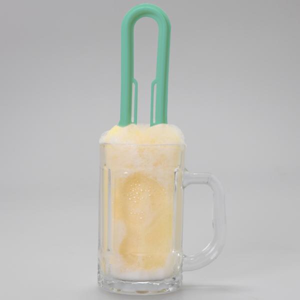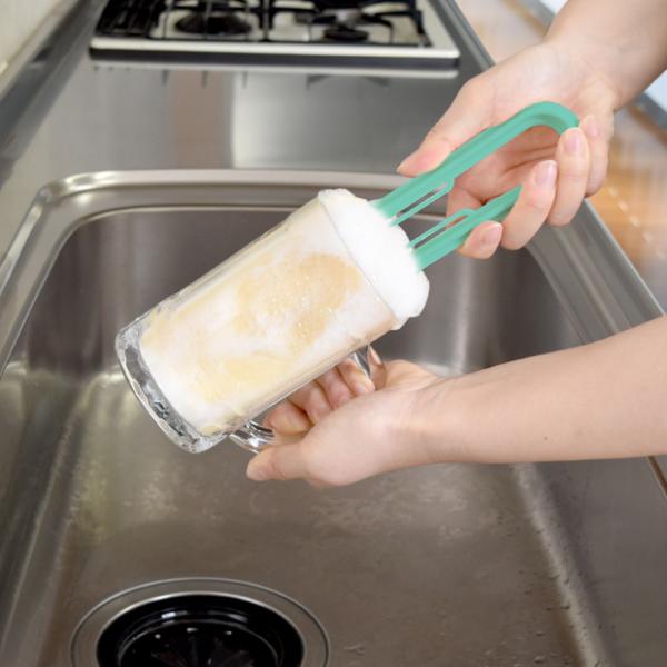 柄が付いたキッチン用のスポンジです。長いサイズなので、底まで手の入らない丈の長いコップを洗うのに最適です。スポンジにコップをはさんで回しながら使えば、両面を一度に洗うことができます。