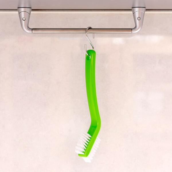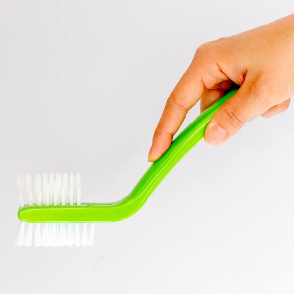 先端をV字にカットした上面のブラシですき間にこびりついた汚れを落とし、下面のコシのあるフラットなブラシで全体を仕上げます。