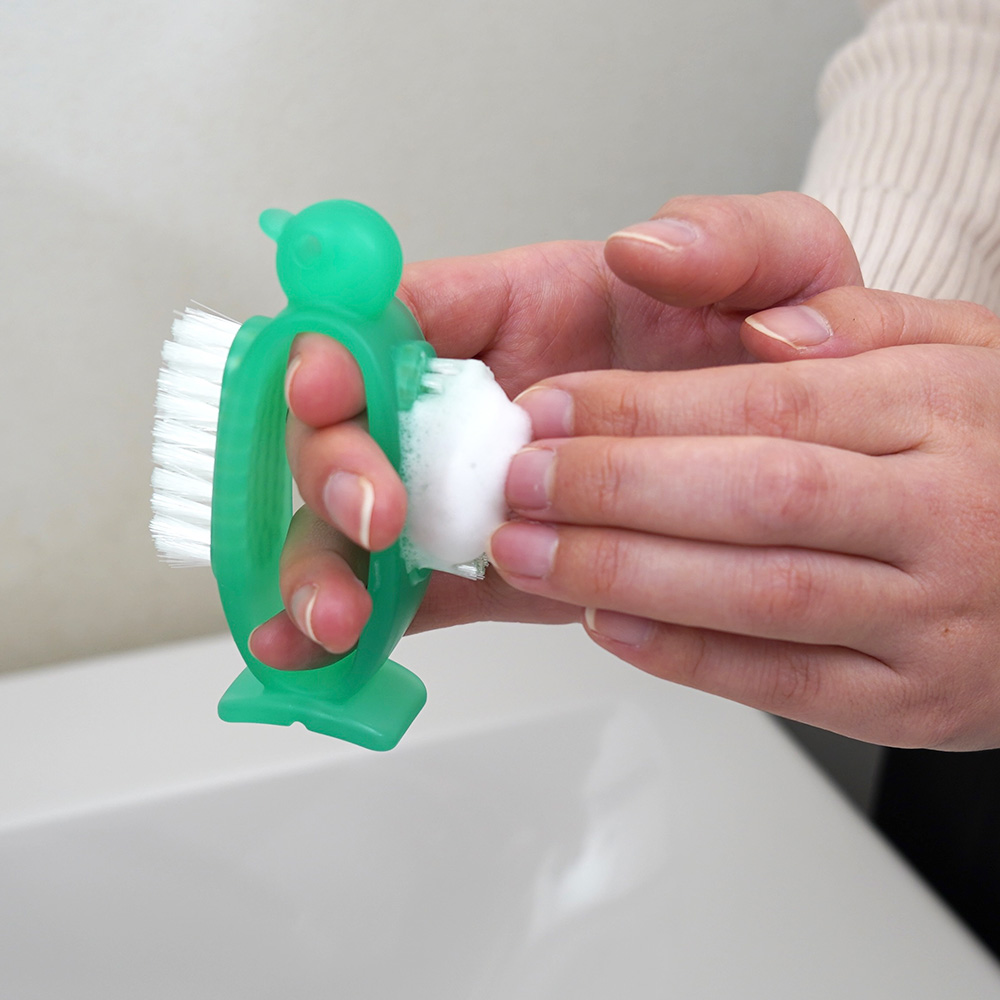 お子様がよろこんで手洗いできるようにペンギンの形をした爪・手洗い専用のブラシです。