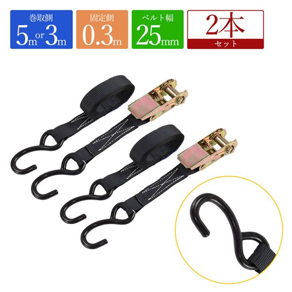 RIDE-FiELD(ライドフィールド) ラッシングベルト ラチェット式 3m 5m フック付き 2本セット 荷締めベルト 荷物固定 荷崩れ防止 黒 防災グッズ