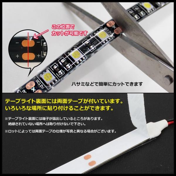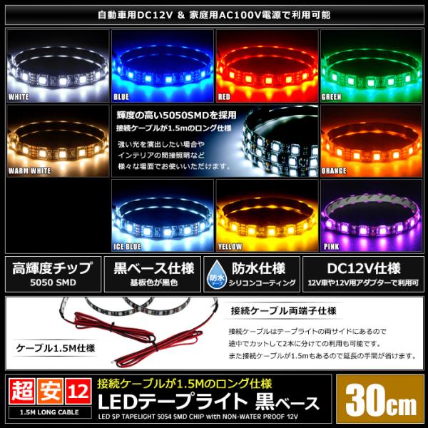 LEDテープライト 防水 12V 30cm 3チップ 黒ベース ケーブル1.5m 両端子