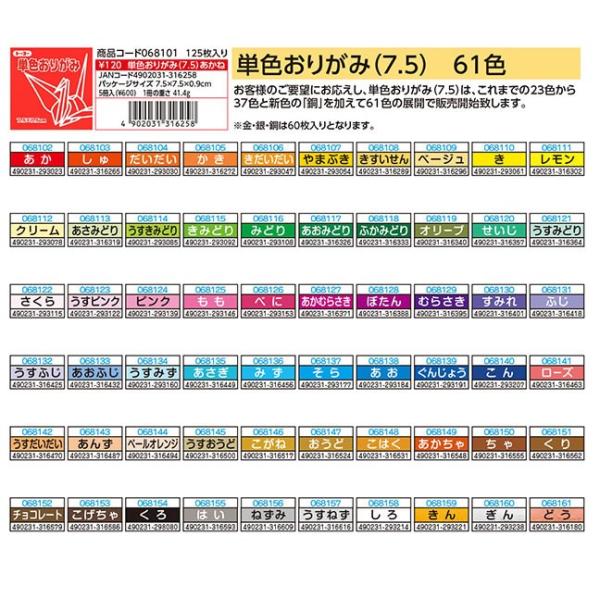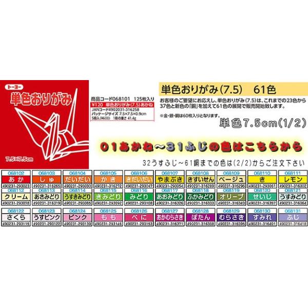 単色折り紙(単色おりがみ千羽鶴向け 7.5cm角) その2(ふじ〜白)(0681xx) 単色折り紙の色数が増えて、61色になりました! 色品番01あかね〜31ふじまで 32うすふじ色〜61銅はこちら 下記リンクより移動してください 各色:125枚入(※金銀銅を除く) 金・銀・銅:60枚入 7.5cmx7.5cm