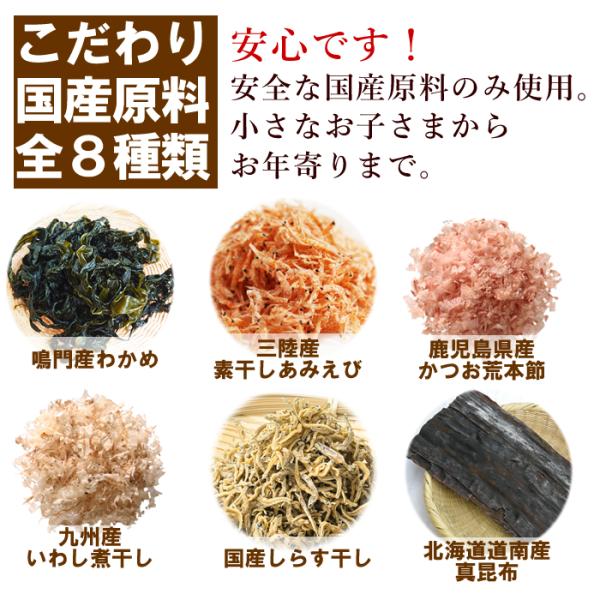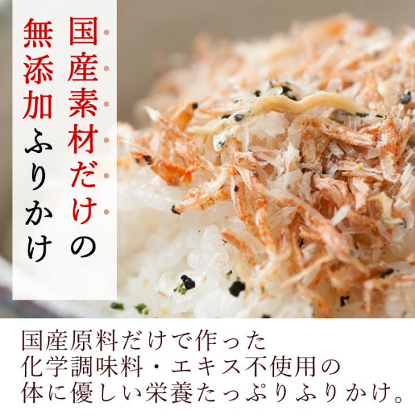 化学調味料・人工的エキス無添加のふりかけです。6種類の国産原料素材を組み合わせることで、シンプルですが深い旨味のある味を引き出しました。やさしい味が特徴です。アスタキサンチンとカルシウムが豊富なアミエビ入り。