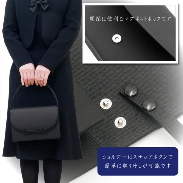 フォーマルバッグ 3点セットは、上品な生地が特徴の女性らしさを感じさせ、さり気ないフチリボンのワンポイトがお洒落なデザインです。職人が一本一本手作業で編み込みしています。使いやすさを重視したハードタイプで、軽量かつ持ちやすいのが魅力です。ブラックはフォーマルな雰囲気を演出します。また、マチ幅が広く、内側にはオープンポケットが2つ付いているので、小物も整理しやすいです。また背面にもポケットがあります。口元にはマグネットが付いており、中身が見えないのもポイントです。さらに、撥水加工が施されているので、雨の日も安心してご利用いただけます。デザイン性と機能性を兼ね備えたアイテムで、喪服や礼服などの大切な場面で活躍します。